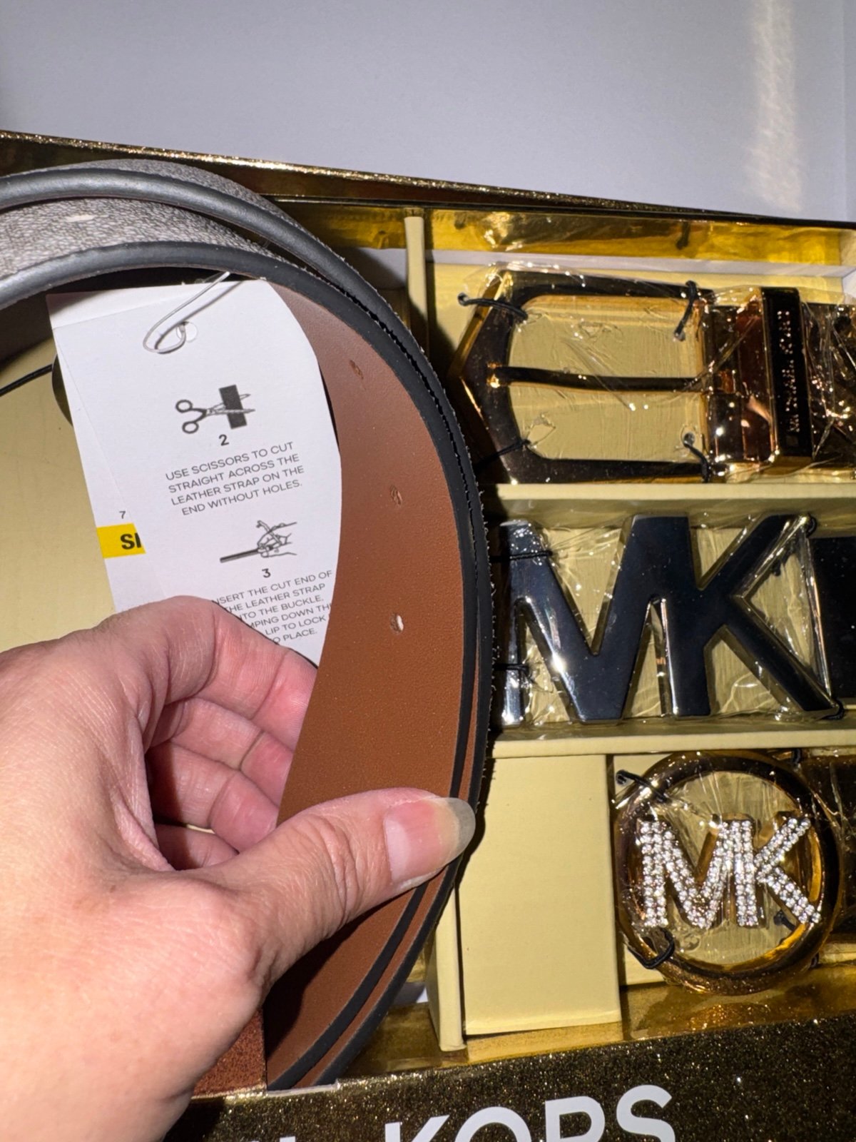 The belt set includes a reversible leather strap and multiple interchangeable buckles, with instructions on the tag to "USE SCISSORS TO CUT LEATHER STRAP ON THE BUCKLE END WITHOUT HOLES". This allows the wearer to customize the belt to their specific waist size. While some Michael Kors belts are sold in specific sizes (such as Small, Medium, or Large), this particular style is intended to be adjusted by the user.